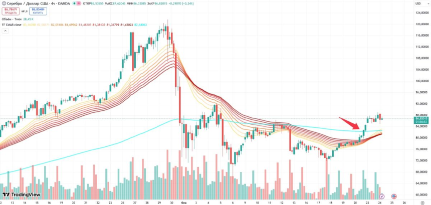 Курс серебра, превысивший EMA за 800 часов